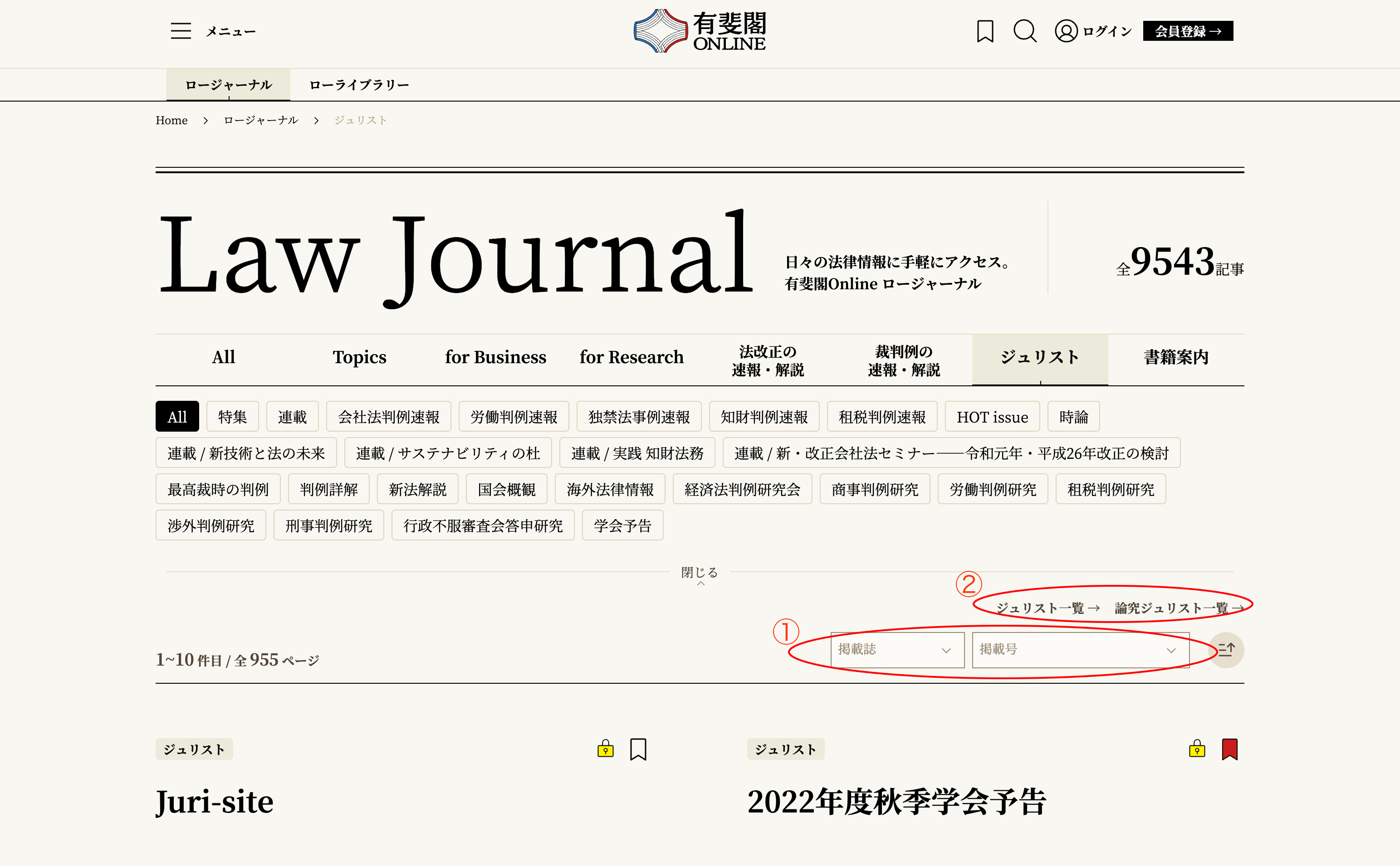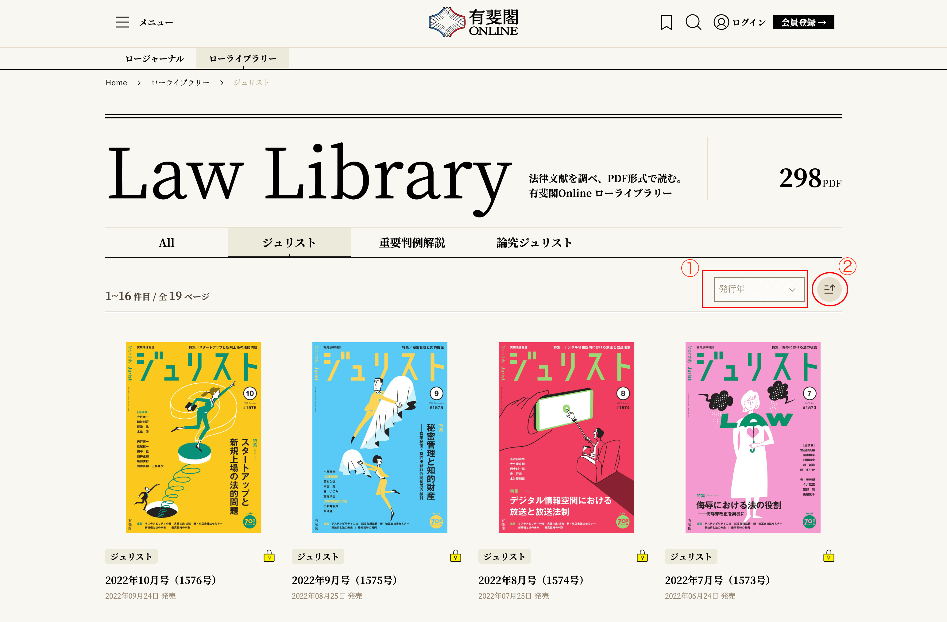 ジュリストカテゴリーでは、雑誌の掲載号による絞り込みができます。左側の掲載誌のプルダウンメニューから「ジュリスト」か「論究ジュリスト」を選択し、右側の掲載号のプルダウンメニューから掲載号を選択すれば、特定の掲載号の記事一覧を見ることができます。¶019