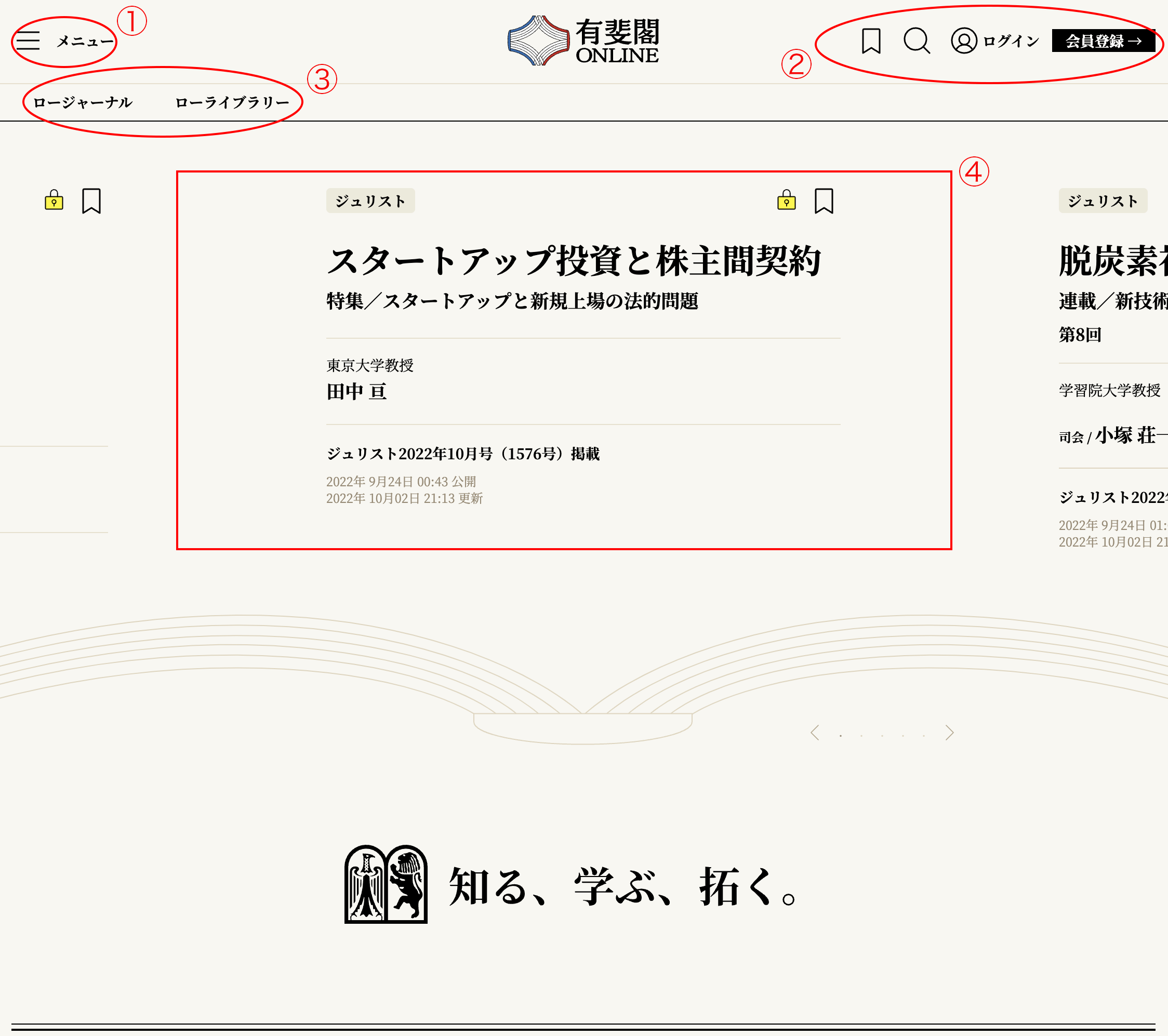 それぞれ、①メニュー/②各種ツール/③ロージャーナル・ローライブラリーへのリンク/④編集部からのおすすめ記事 です。¶002