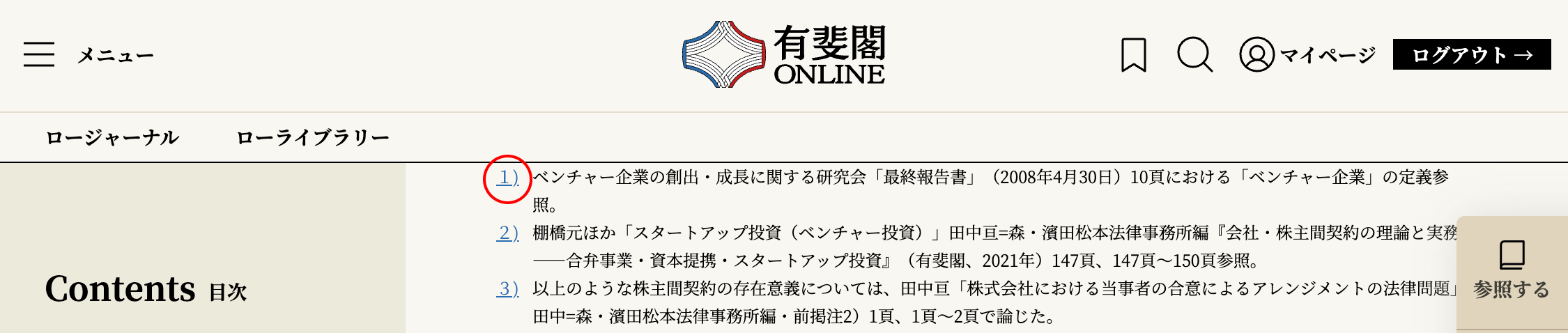 このボタンを押すと、記事を読みながら、六法全書や有斐閣法律用語辞典を検索して、条文や用語の説明を参照することができます(→「参照する」ボタン)。¶008