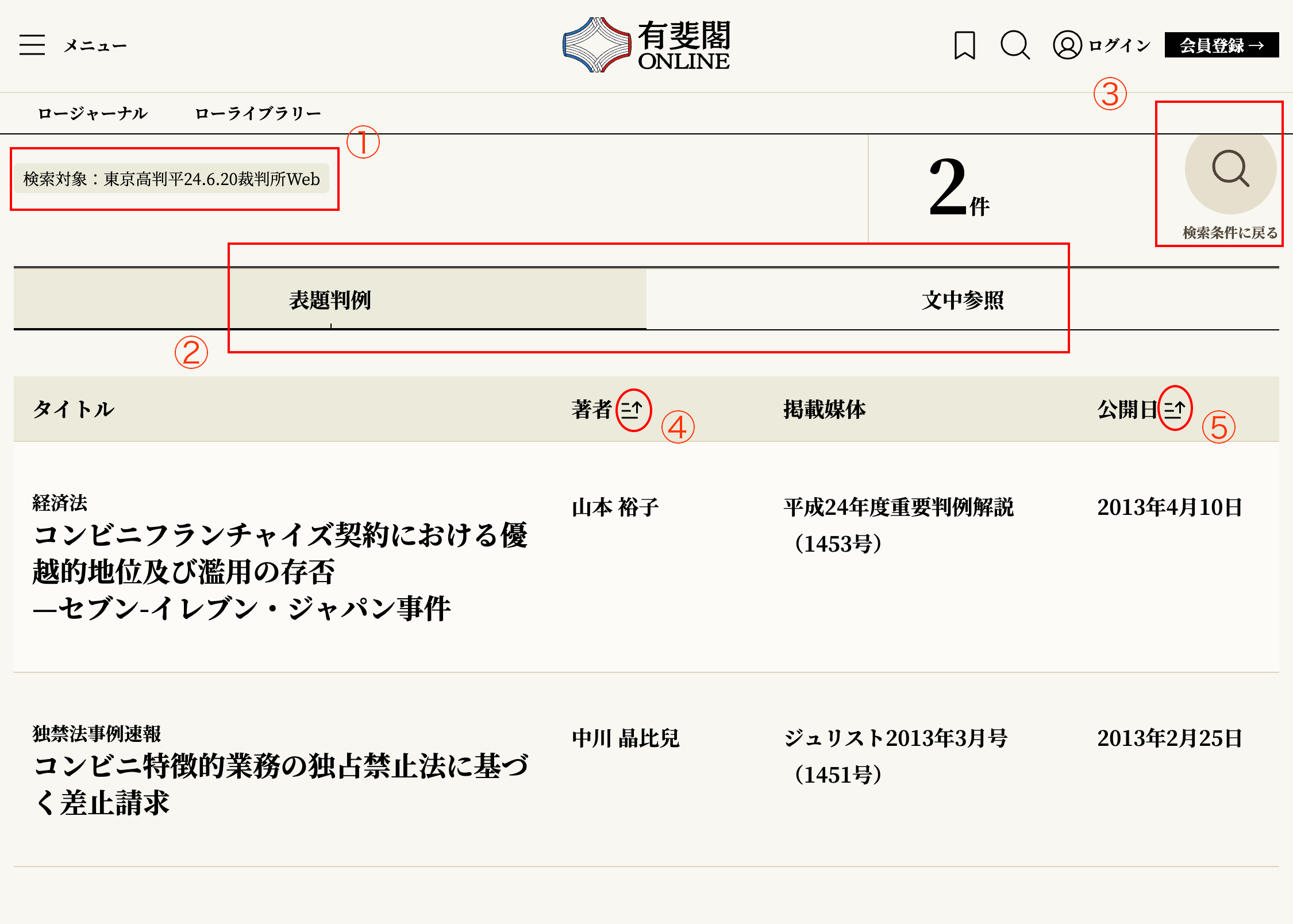 記事の中には、いくつかの形でリンクがついています(→HTML記事の概要)。このうち、裁判例等についているリンクをクリックすると、当該裁判例等に関する有斐閣Online内の別の記事の一覧ページにジャンプします。¶002