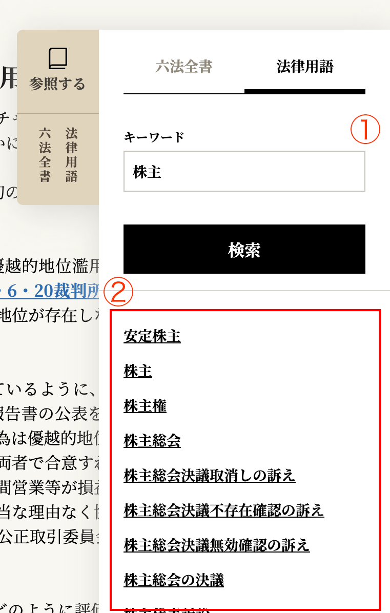 ①のボックスに、検索したい用語を入力します。入力後、検索ボタンをクリックすると、②の欄に検索結果が表示されます。この検索結果の中から参照したい用語を選んでクリックすると、用語解説が表示されます。¶009