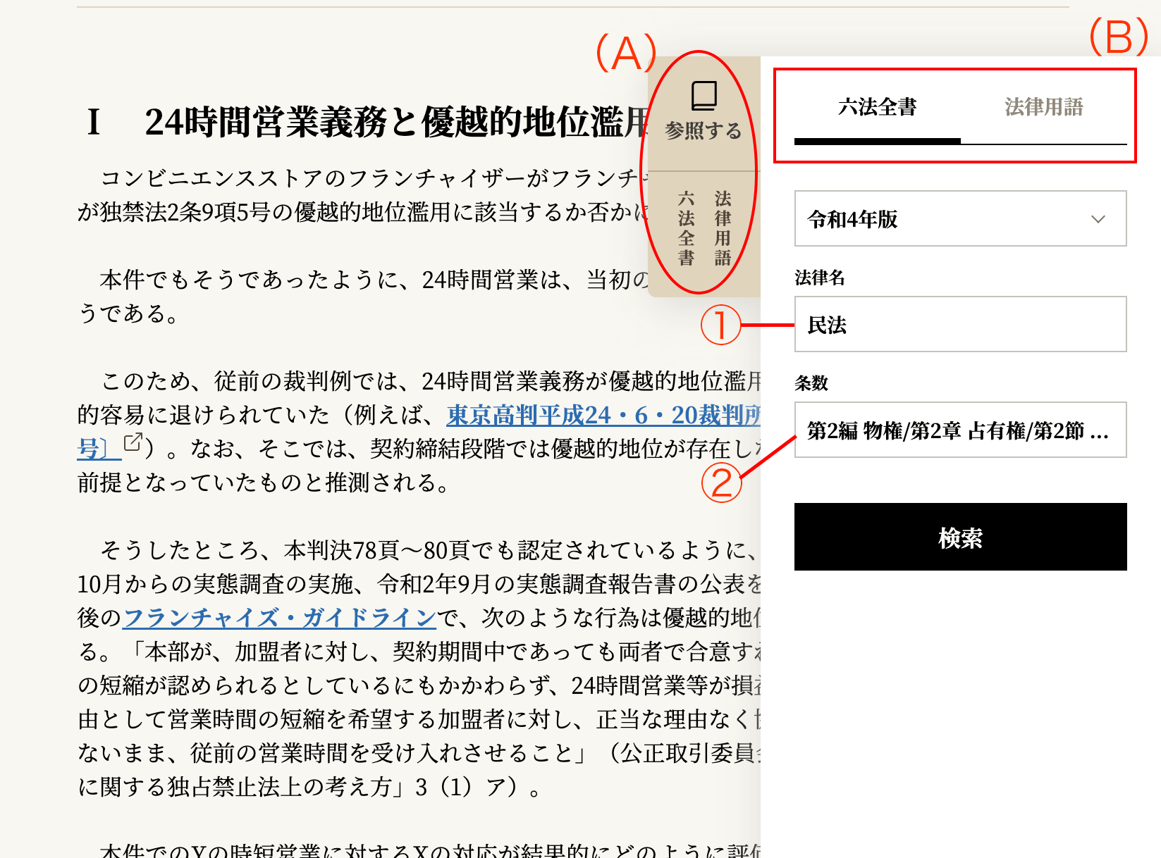 有斐閣Onlineロージャーナルでは、記事を読みながら、六法全書や有斐閣法律用語辞典を参照することができます。図の(A)ボタンをクリックすると、六法全書の検索画面が現れます。もう一度クリックすると、この検索・参照画面を閉じることができます。(B)は、検索・参照対象を六法全書と有斐閣法律用語辞典とで切り替えるタブです。¶002