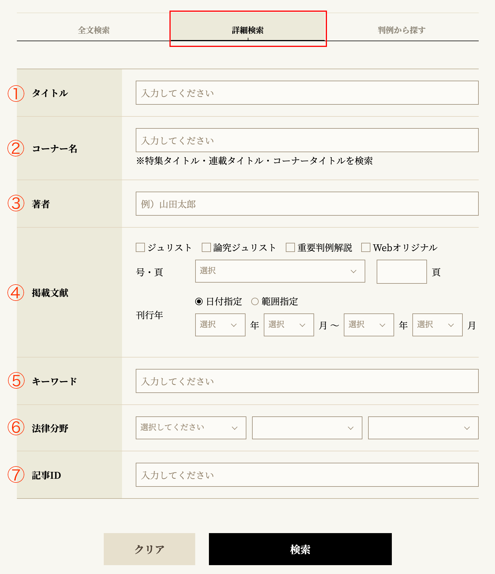 「詳細検索」のタブからは、さらに詳しい条件を指定した検索ができます。¶007