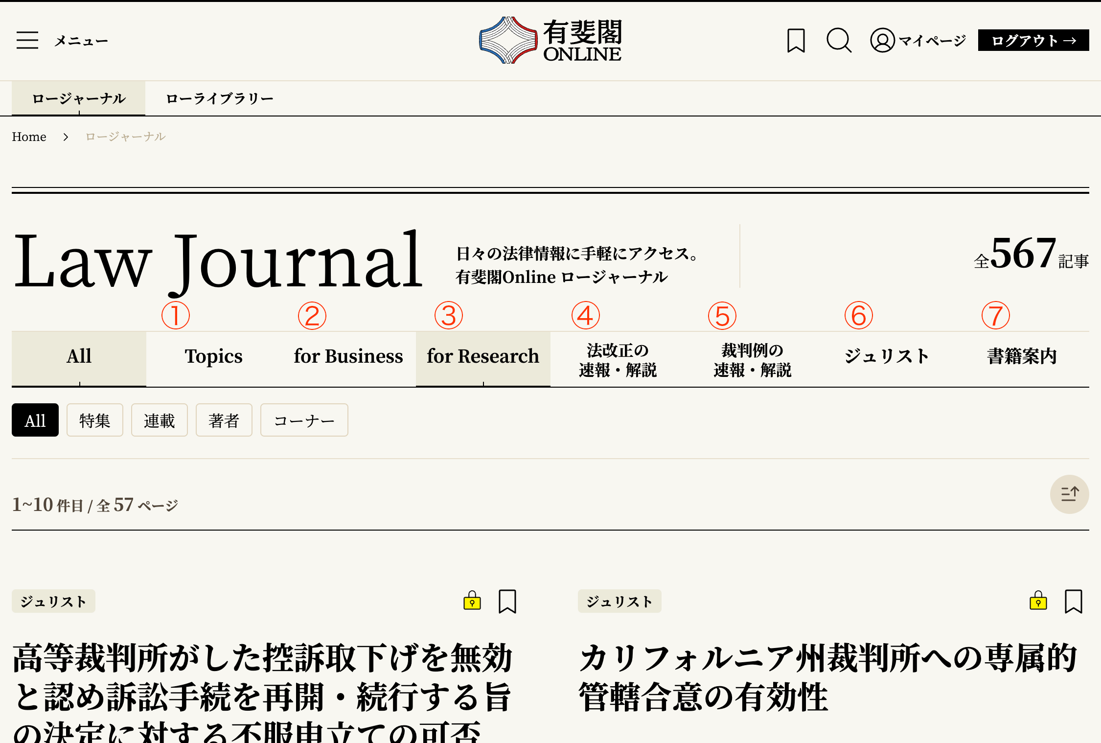 有斐閣Onlineロージャーナルには、Webオリジナル記事と、ジュリストなどの雑誌に掲載された記事が収録されており、各記事は内容等に応じて7つのカテゴリーに分類されています(1つの記事が複数のカテゴリーに属する場合もあります)。各カテゴリーから探すことで、目的に合った記事に、よりスムーズにアクセスすることができます。¶020