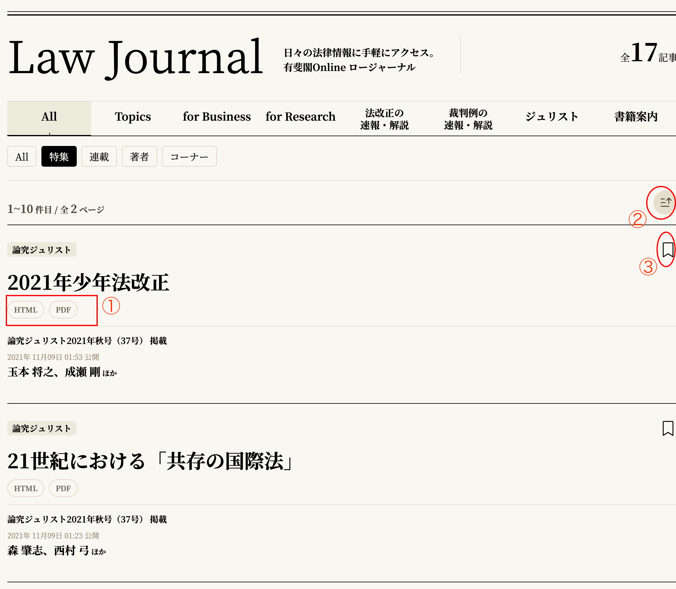 また、有斐閣Onlineロージャーナルのページから、各カテゴリーを選択した後、そのカテゴリーに含まれる特集や連載の一覧を表示することもできます。¶029