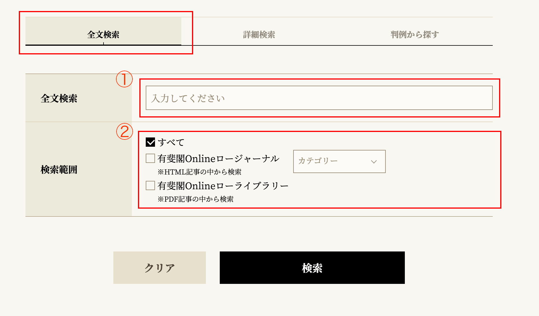 全文検索の検索範囲を、有斐閣OnlineロージャーナルのHTML記事に絞ったり、有斐閣OnlineローライブラリーのPDF記事に絞ったりすることができます。さらに有斐閣Onlineロージャーナルの記事は、「for Research」や「裁判例の速報・解説」といったカテゴリーを絞って検索することも可能です。¶006