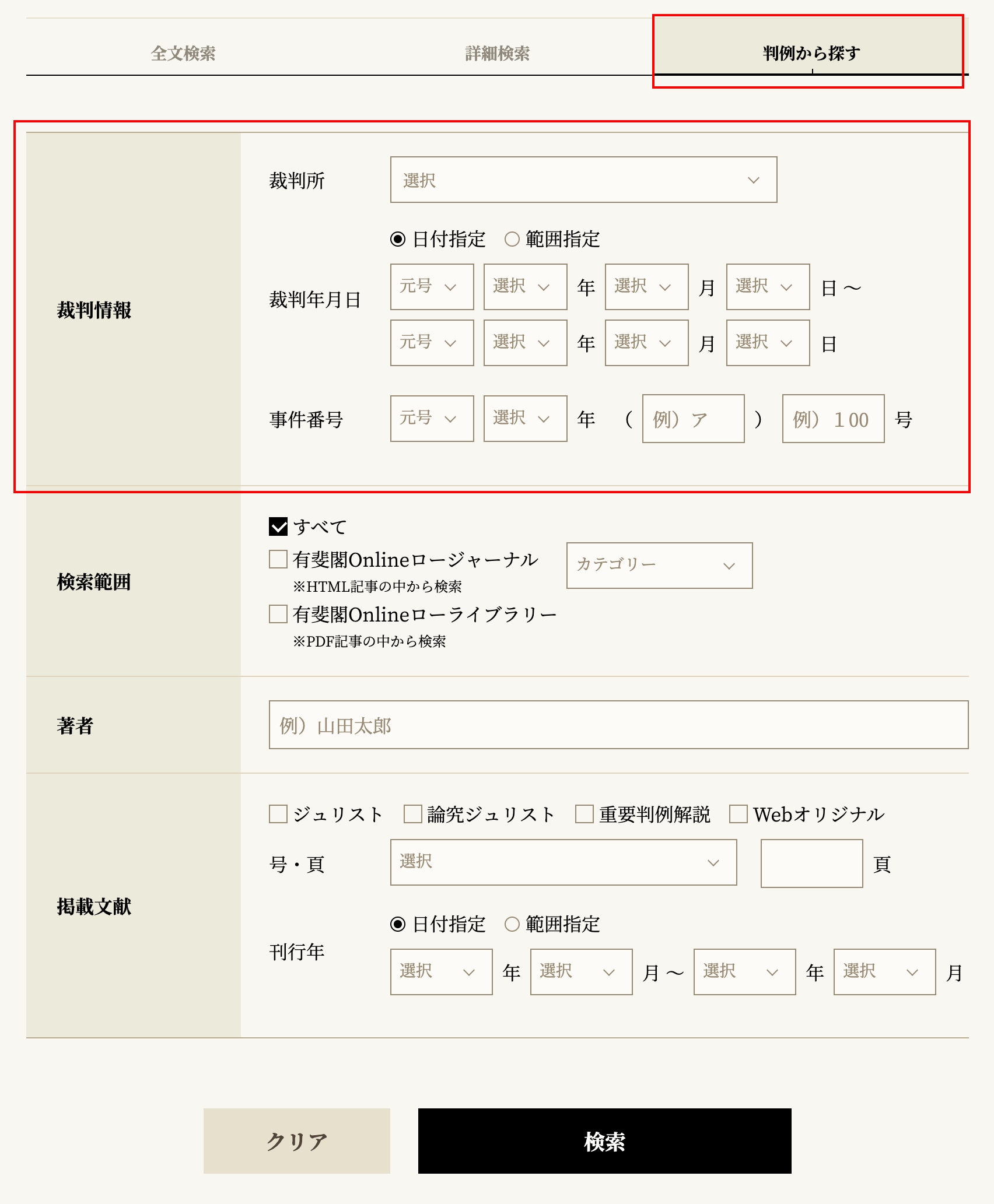 「裁判情報」の中に、目的の裁判例の情報を入力して、検索します(「裁判所」は現在、略表記での選択肢となっています。例:最高裁大法廷=最大、東京地方裁判所=東京地。文字を入力すると、その文字を含む裁判所名が候補として表示され、その中から選択できます)。¶018