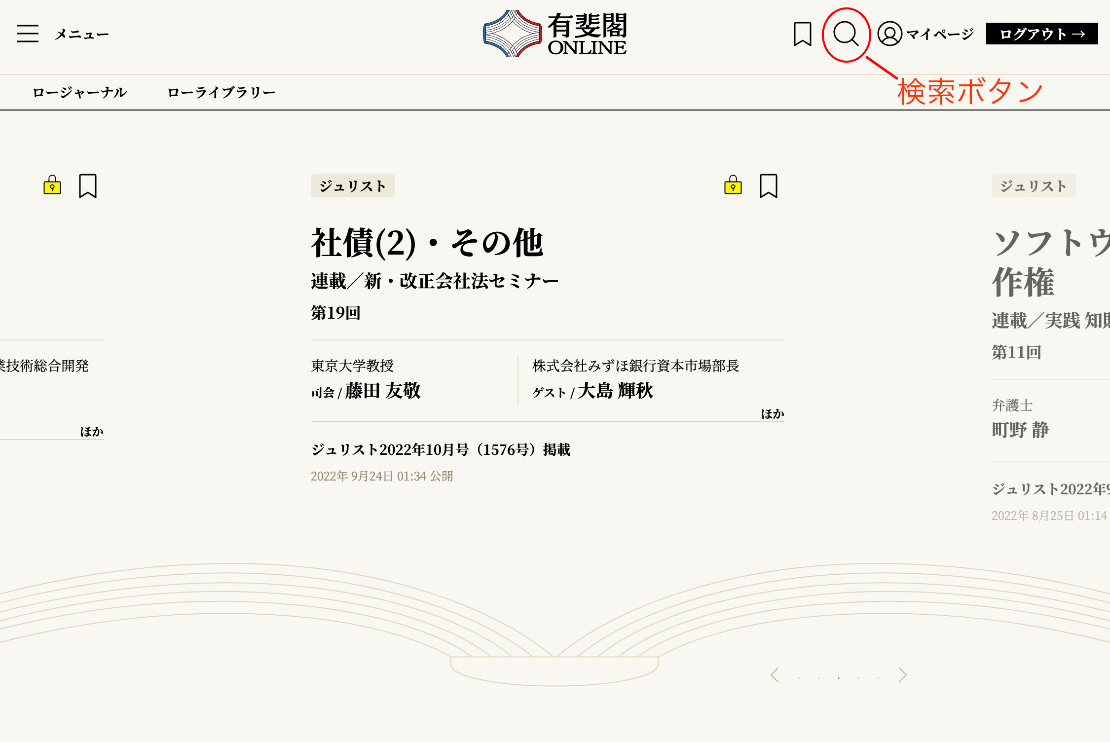 紙で刊行された雑誌の中から記事を探す場合は、有斐閣Onlineローライブラリーの一覧表示を使って、記事を探すことができます(→有斐閣Onlineローライブラリーから)。¶034